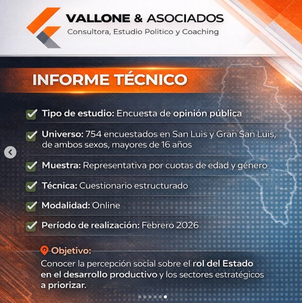 Una reciente encuesta de opinión pública, realizada por la consultora Vallone & Asociados durante febrero de 2026, arroja luz sobre las expectativas y demandas de la sociedad en San Luis y Gran San Luis. El estudio, que relevó a 754 personas mayores de 16 años, revela una tendencia clara hacia la modernización productiva y un Estado que asuma un rol activo en el desarrollo.